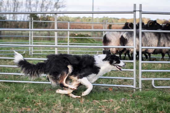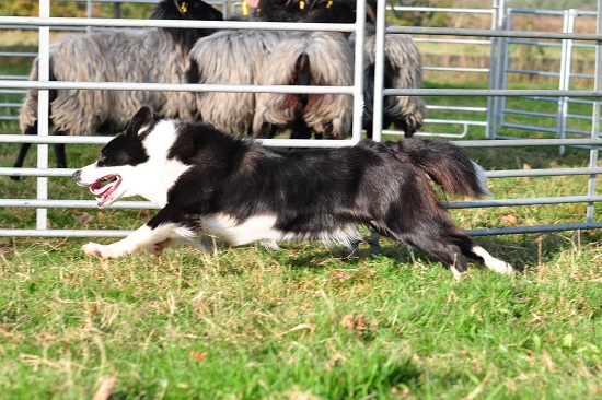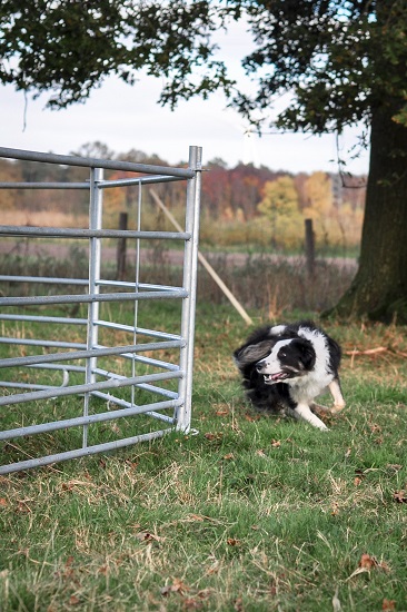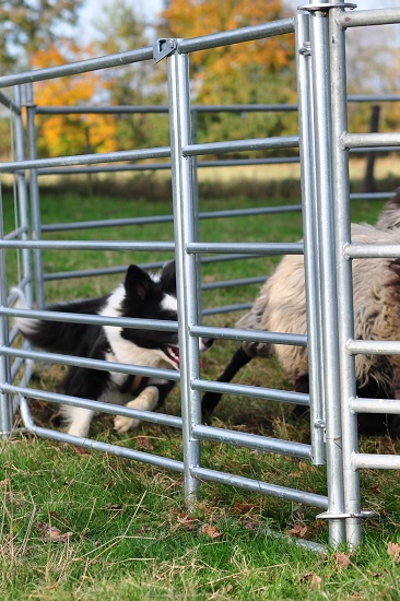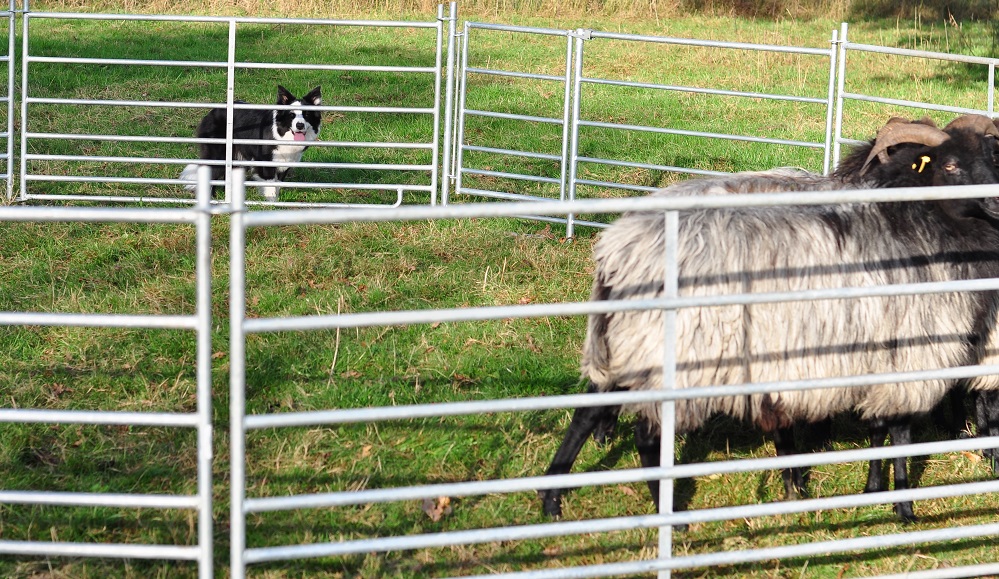 So habe ich die Gelegenheit, alles von außen zu betrachten und Fotos zu machen. Enola ist sehr aufgeregt, wenn sie um den Roundpen rennen darf, entwickelt aber zügig eine Strategie, wie man dem Menschen und den Schafen gerecht wird. Sie ist wendig, schnell und ihre Ohren sind voll bei der Sache. Schnell hatte sie gelernt, wenn man rechts um die Schafe geht, funktioniert es und sie sind kontrollierbar.