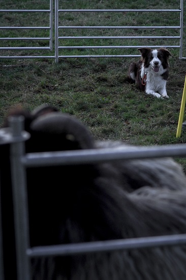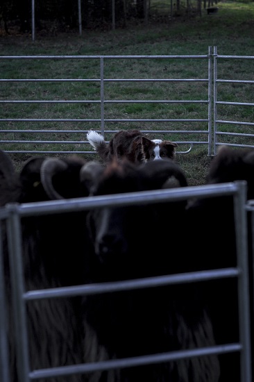 Nach Indy seiner Trainingseinheit und einem Abschluss Spaziergang zum Cool down war auch Ambar eingetroffen. Leider hatte ein Umweg Zeit gekostet und das Licht des Tages wurde zusehens weniger. Dennoch sollte es auch für sie möglich sein, einmal Schafsluft schnuppern zu dürfen. Respektvoll und eher auf Abstand begann Ambar. Ihr waren die gehörnten Tiere nicht so geheuer und so gebrauchte sie ihre Strategie, mit Stimme zu arbeiten und einzuschüchtern.